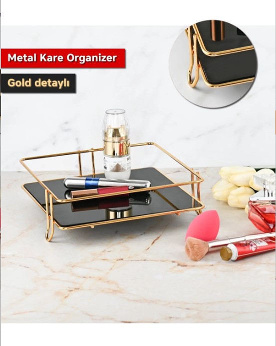 Kaliteli Malzeme: Metal altın renkli kozmetik takı düzenleyici, dayanıklı ve şık tasarımıyla dikkat çeker. ; Çok Amaçlı Kullanım: Bu organizer, banyo tezgahınızı düzenlemek için idealdir. Makyaj fırçaları, rujlar, takılar veya küçük banyo malzemeleri için kullanılabilir. ; Kare Tasarım: Kare şekli sayesinde kompakt bir alanı kullanarak çok sayıda kozmetik veya takıyı organize etmenizi sağlar. Tezgahınızda az yer kaplar. ; Estetik ve Şık: Altın rengi ve metalik görünümüyle, banyonuza veya makyaj masanıza zarif bir dokunuş katar. Modern ve minimal bir tasarıma sahiptir. ; Kolay Temizlik: Pürüzsüz metal yüzeyi, kolayca temizlenip silinebilir. Suya dayanıklıdır ve uzun süre dayanıklılığını korur. ; Hediyelik Ürün: Sevdiklerinize veya arkadaşlarınıza şık bir hediye seçeneği olabilir. Kozmetik tutkunları için pratik ve kullanışlı bir hediye alternatifidir. ; Taşınabilirlik: Hafif yapısı sayesinde istediğiniz zaman yerini değiştirebilir veya seyahatlerinizde kullanabilirsiniz. ;